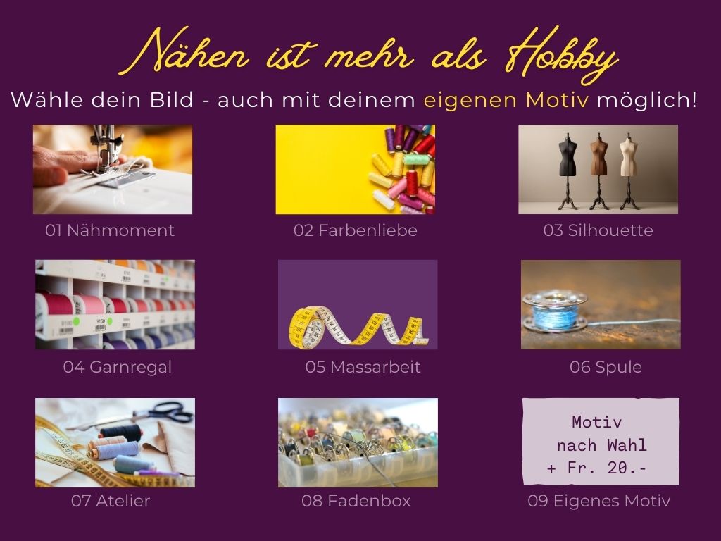 Du kannst aus acht liebevoll gestalteten Nähmotiven wählen – kleine Details aus dem Atelier, die man sofort versteht, wenn man selber näht.